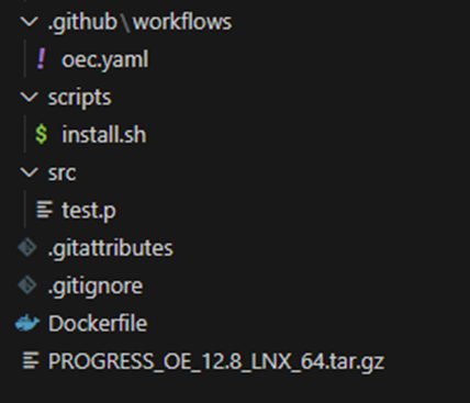 In the initial approach, we manually uploaded the Progress OpenEdge installer (PROGRESS_OE.tar.gz) and response file (response.ini) into the repository, then used a custom Dockerfile and shell script to perform a silent installation inside the GitHub Actions runner. While this works, it has a few major drawbacks: